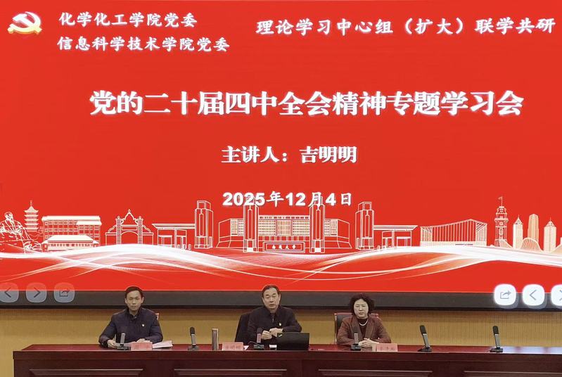 为引导师生深入学习贯彻党的二十届四中全会精神,12月4日下午,信息科学技术学院与化学化工学院联合召开党的二十届四中全会专题学习会。市委宣讲团成员、校党委常委、副校长吉明明应邀做专题辅导报告。信息科学技术学院、化学化工学院、智能信息技术研究中心全体教职工及学生代表参加会议。信息科学技术学院党委书记周平主持会议。