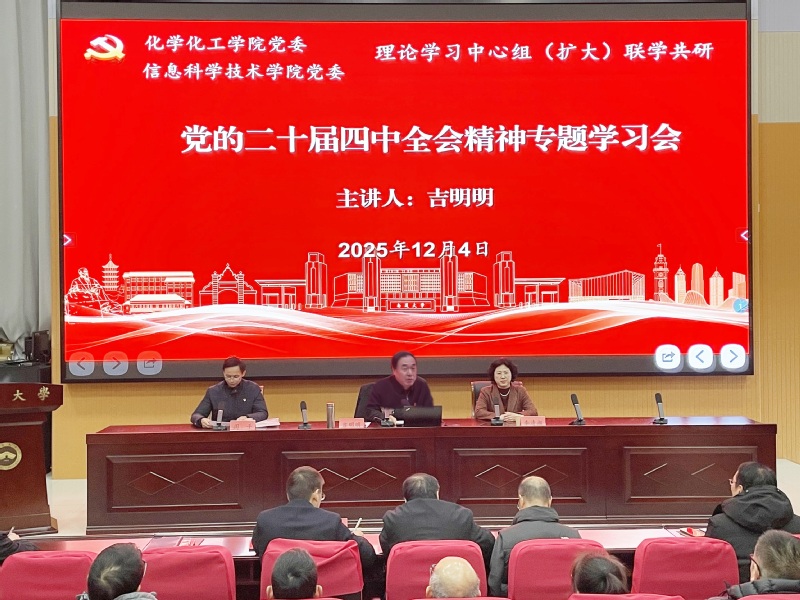 为引导师生深入学习贯彻党的二十届四中全会精神,12月4日下午,信息科学技术学院与化学化工学院联合召开党的二十届四中全会专题学习会。市委宣讲团成员、校党委常委、副校长吉明明应邀做专题辅导报告。信息科学技术学院、化学化工学院、智能信息技术研究中心全体教职工及学生代表参加会议。信息科学技术学院党委书记周平主持会议。