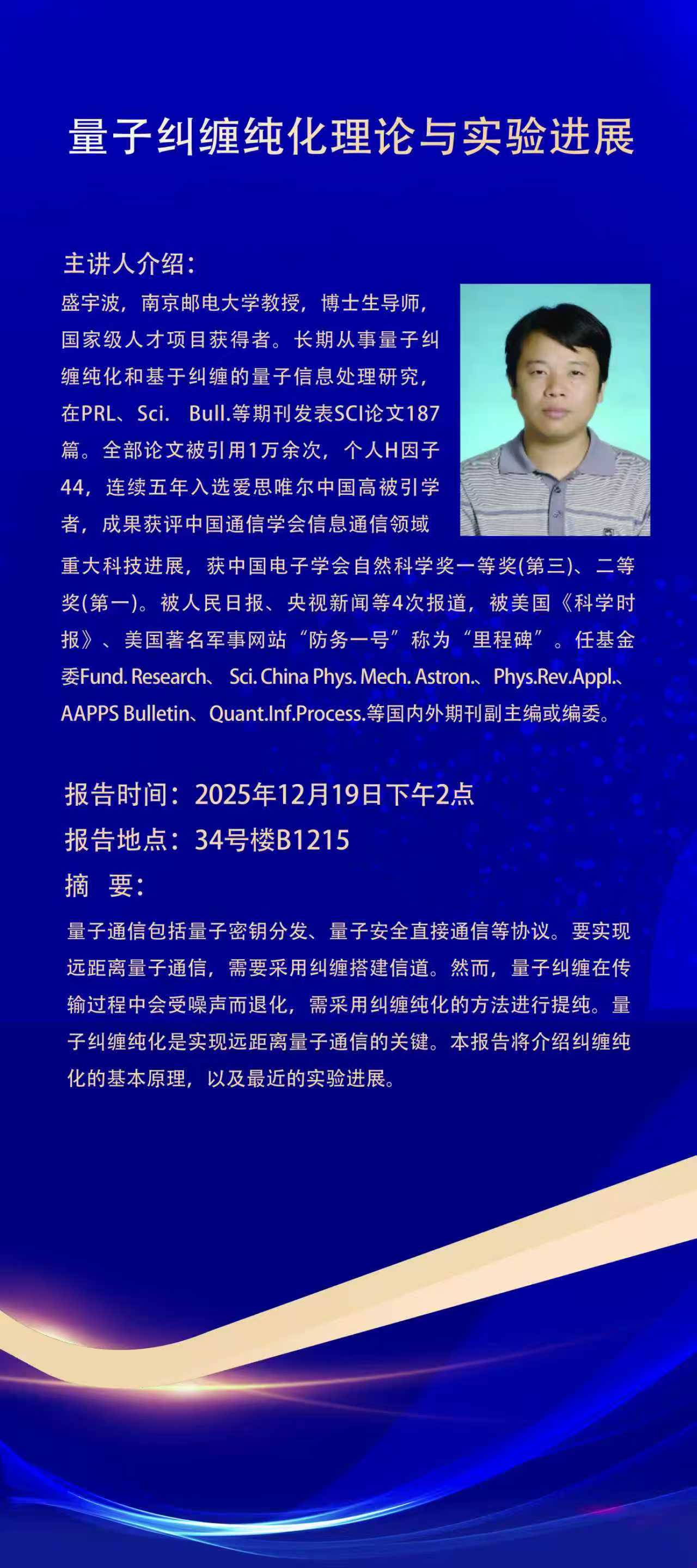 讲座预告:量子纠缠纯化理论与实验进展