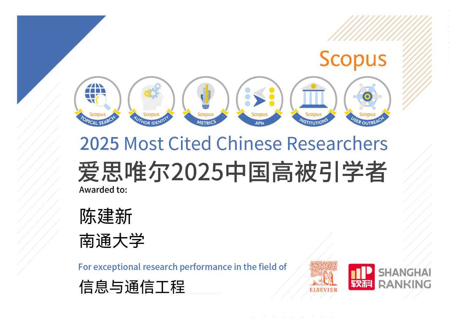 1月30日,国际知名学术出版机构爱思唯尔(Elsevier)发布2025年“中国高被引学者”(Highly Cited Chinese Researchers)榜单。我院陈建新教授继2024年入选后,2025年再次成功入选,蝉联此项重要学术荣誉。