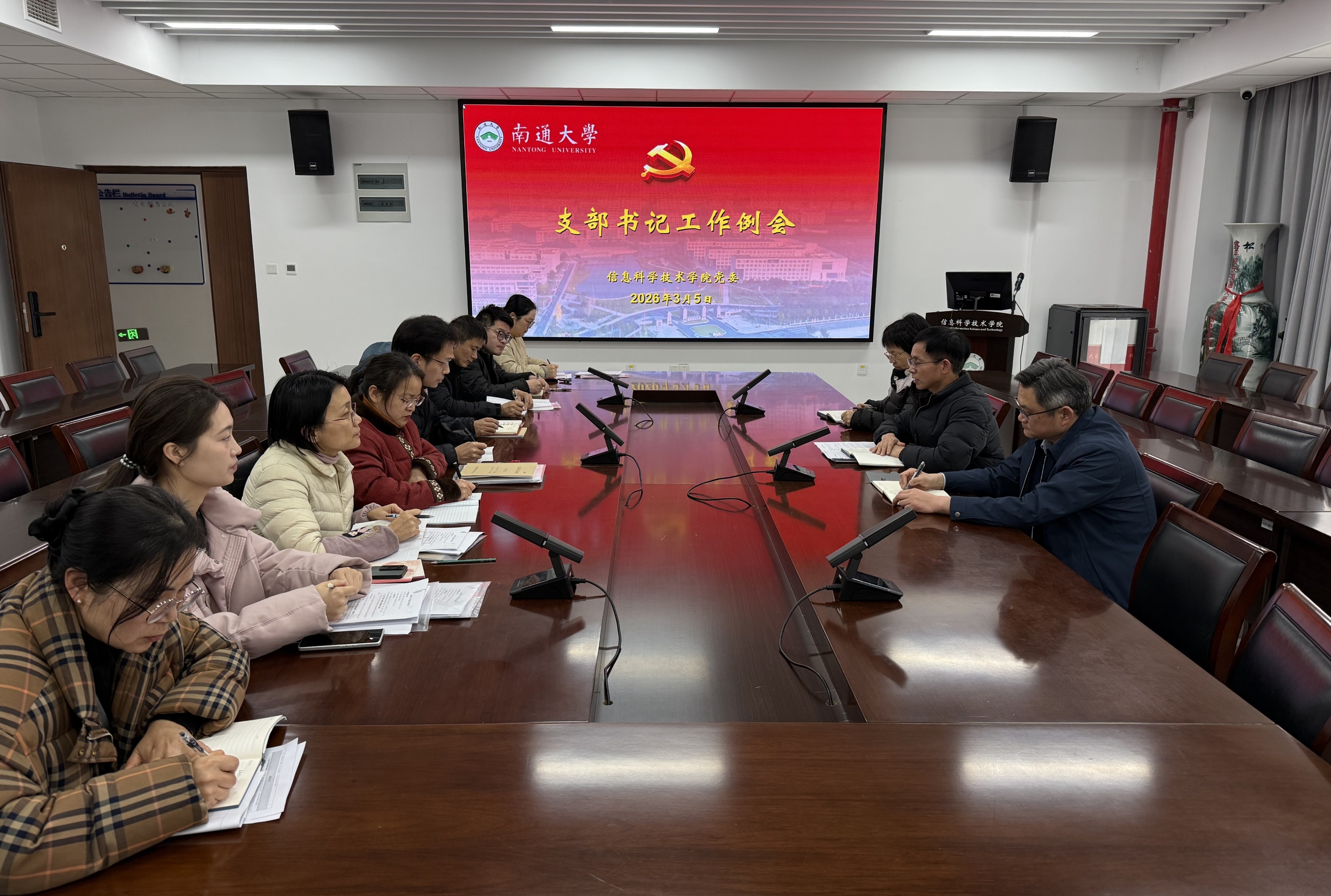 3月5日上午,信息科学技术学院党委召开2026年第一次党支部书记例会。总结2025年党建工作,部署2026年党建重点任务。院党委书记周平主持会议,院党委副书记、副院长刘俊,院党委纪检委员沈晓燕,院党委兼职组织员及全体党支部书记参加会议。