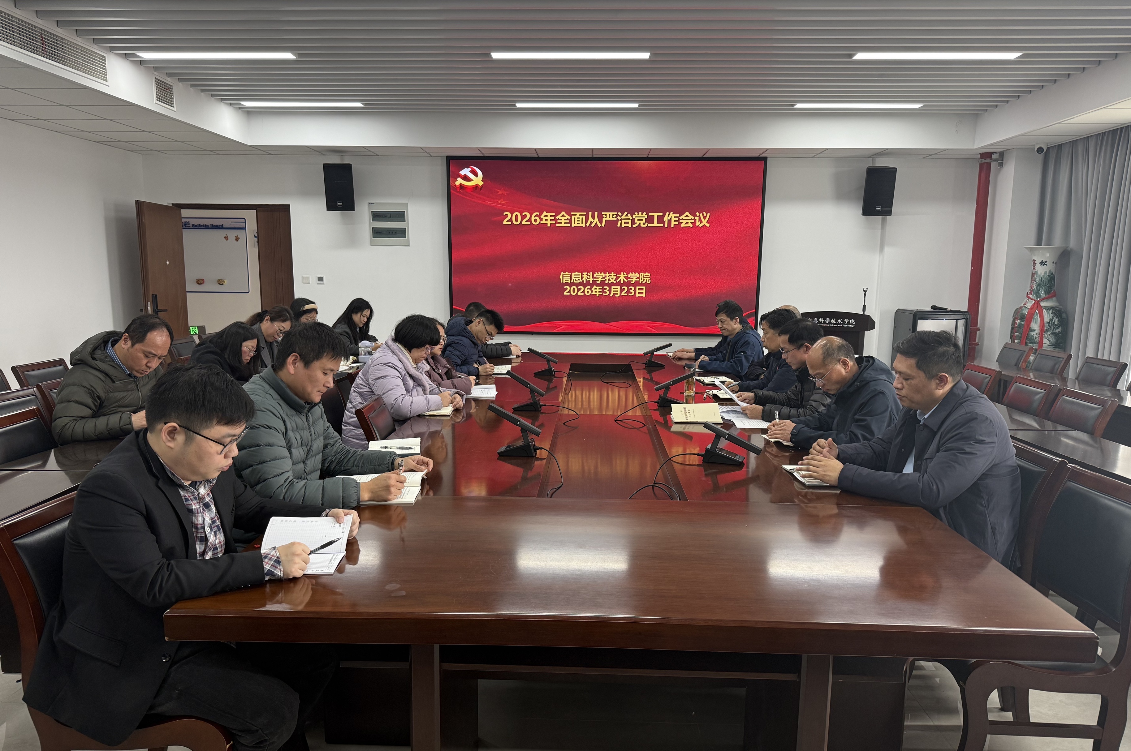 3月23日上午,信息科学技术学院党委召开2026年全面从严治党工作会议,深入学习贯彻二十届中央纪委五次全会、十四届省纪委六次全会及校党委书记杨宇民在全校全面从严治党工作会议上的讲话精神,总结学院管党治党成效,分析当前形势与不足,部署年度重点任务。学院及智能信息技术研究中心班子成员、党委委员、院长助理、支部书记及系(室)负责人参加会议,院党委书记周平主持会议。